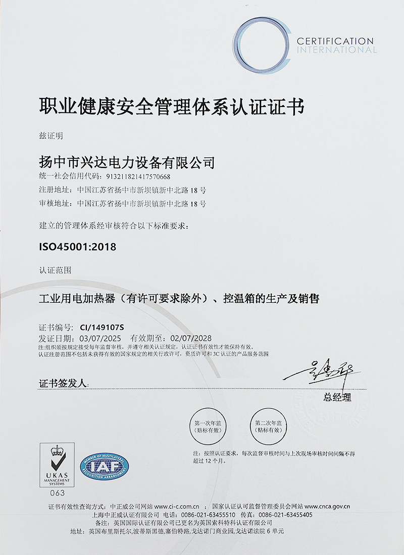 职业健康安全管理体系认证证书